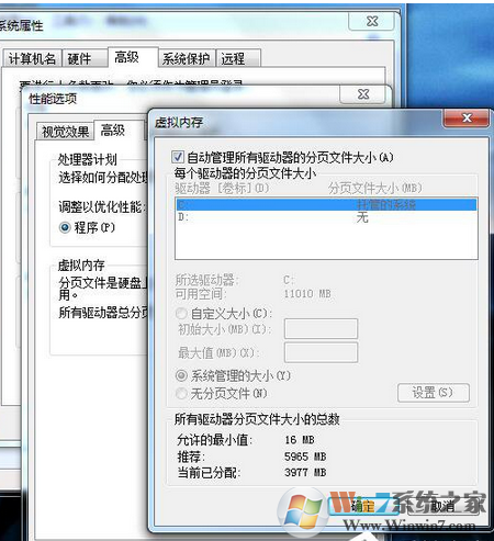 1、计算机-属性-高级系统设置-性能设置-“高级”选项卡-虚拟内存-更改-选择要设置的驱动器c盘,选择系统管理大小或者根据需要选择自定义大小-设置-确定。这最好的方法当然是建议增加物理内存。