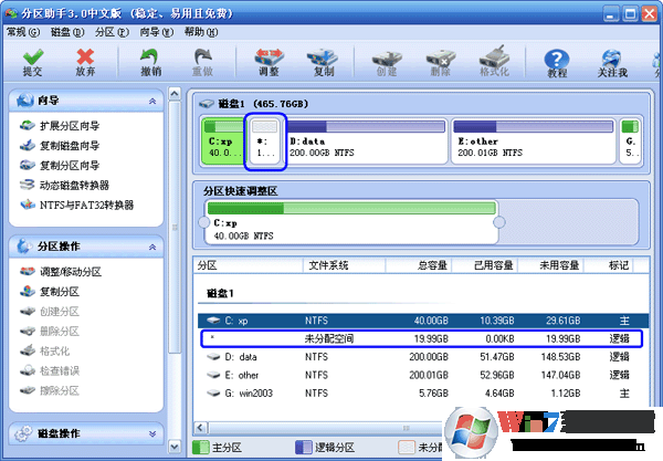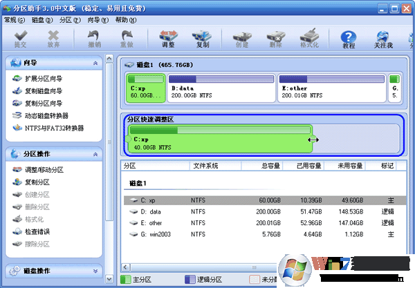 2、这步的目标是缩小C盘,请选中C盘并移动鼠标到“分区快速调整区”的最右端,然后当鼠标指针变成双向箭头时,点击圆形的手柄并向左拖动鼠标来缩小这个分区到40GB,如下图2所示:(您也可以右击C盘选择“调整/移动分区”选项来缩小C分区) xiuchufang.com