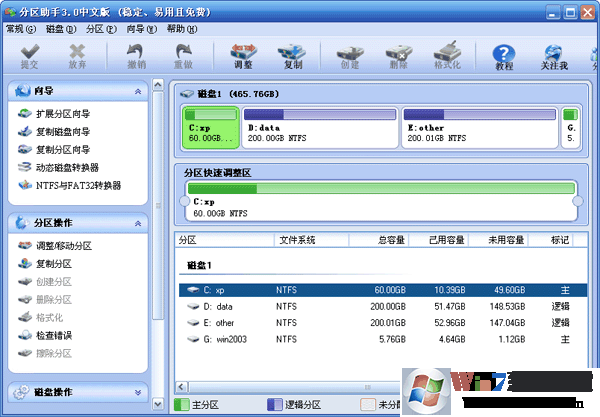 1、首先下载分区助手专业版,安装并运行它。在主界面上您可以看到C盘有60GB的空间,D盘有200GB的空间,如下图所示。这个例子将压缩C盘到40GB将压缩出的空间分配给D盘使用,使D盘达到大约220GB的空间。