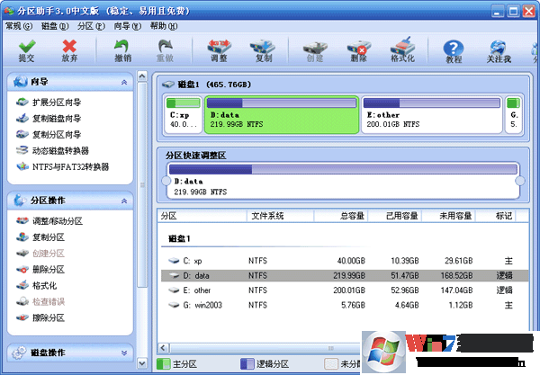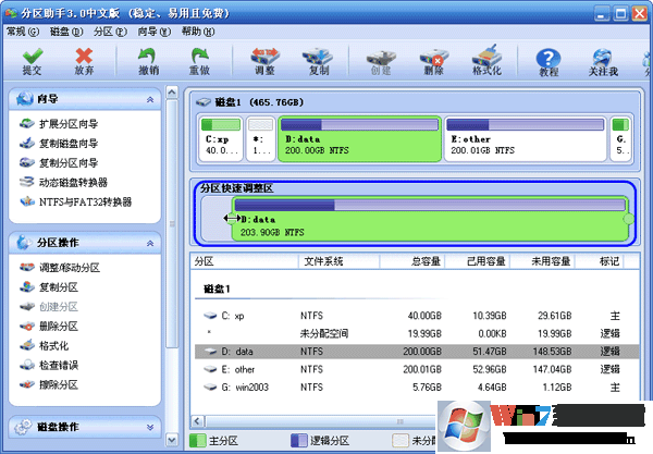 4、点击D盘,并移动鼠标到“分区快速调整区”的最左端,然后当鼠标指针变成双向箭头时,点击圆形的手柄并向最左边拖动鼠标以让D盘占用这19.99GB的未分配空间,如下图4所示:(您也可以右击D盘选择“调整/移动分区”选项来设定D分区的新大小)
