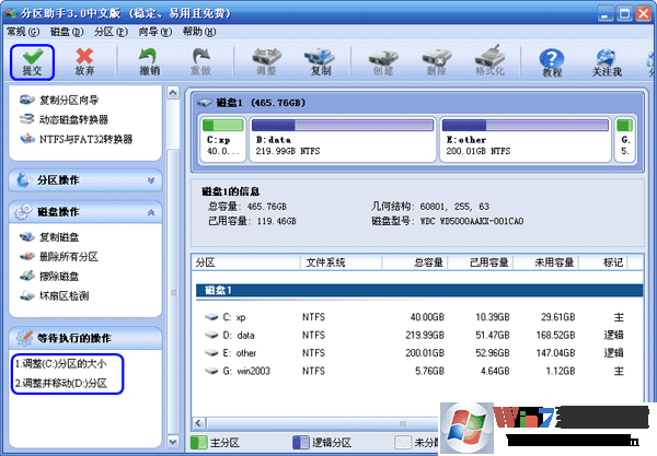 6、最后不要忘记点击工具栏上的“提交”按钮来执行真实的操作,另外您可以在主界面上看到等待执行的操作中有两个操作(蓝色框圈住的地方),如下图6,即把这个操作保存到磁盘上。执行过程中可能需要花一会时间,所花时间的长短由分区中的数据的多小而定。这需要您耐心地等待,绝对不要强行关闭分区助手。