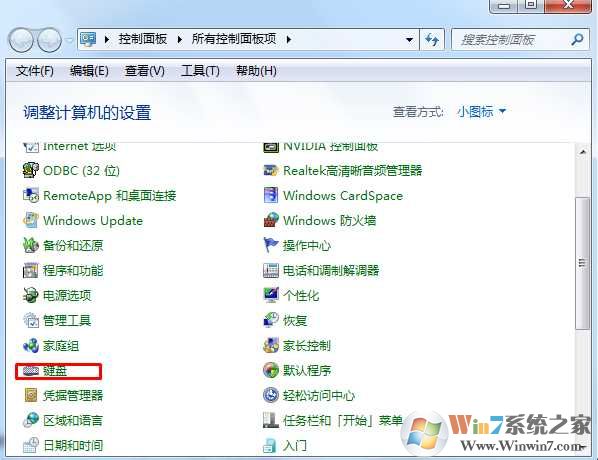 1、打开控制面板,找到“键盘”点击,如下图所示: