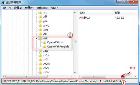 2、在打开的注册表编辑器中,定位到HKEY_CURRENT_USER\\SOFTWARE\\MICROSOFT\\WINDOWS\\currentversion\\Explorer\\FileExts\\.lnk 路径。(如下图所示)请将除了openwithlist和 openwithprogids这两项以外的其他项全部删除。