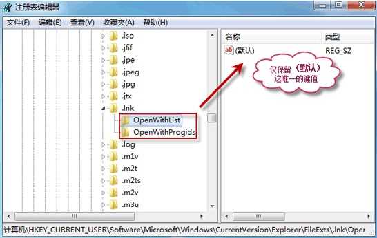 3.、分别展开openwithlist和openwithprogids。在右边细节窗口中,请将除默认键值以外的所有键值也都删除。