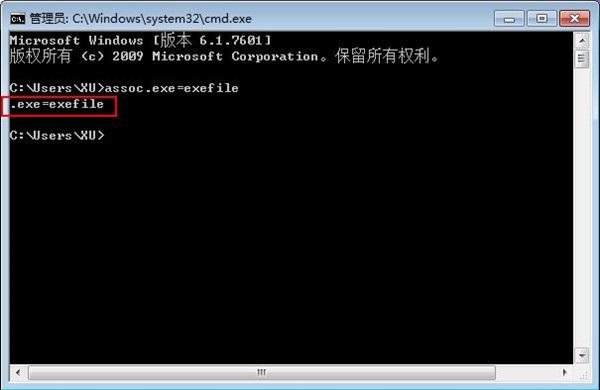 3、此时屏幕上显示“.exe=exefile”,关闭命令提示框并重启电脑。www.xiuchufang.com