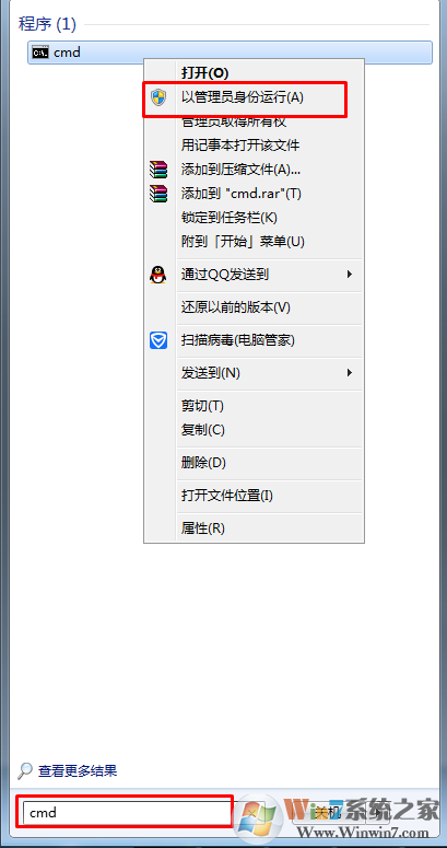 1、开始菜单→搜索栏输入cmd,然后右键以管理身份运行命令提示符;