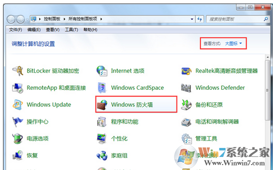 2、在控制面板中将查看方式修改为“大图标”,然后点击“Windows防火墙”;
