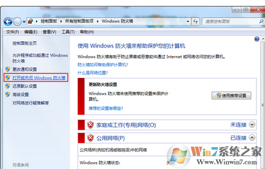 3、在防火墙窗口左侧点击“打开或关闭Windows 防火墙”