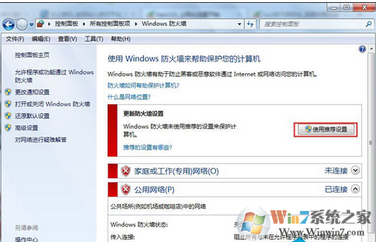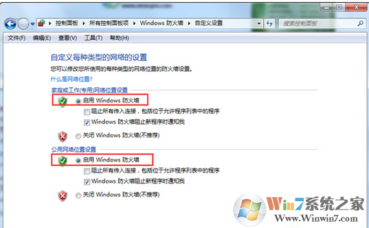 5、在弹出的窗口中将“家庭或工作(专用)网络位置设置”和“公用网络位置设置”下方都选择为“启用Windwos 防火墙”即可。
