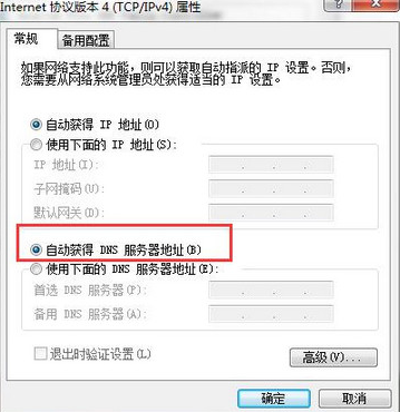 4、接着在界面中,将下面的dns设置为“自动获得DNS服务器地址”,并点击确定,