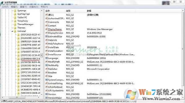 2、展开Uninstall项之后,我们会看到很多如{000F2A10-9CDF-47BF-9CF2-9AC87567B433}这样名称的子项,每一个子项对应的都是“卸载或更改程序”的列表中的项目,我们可以针对子项中DisplayName所显示的数据来分辨是哪个程序的。以下图为例,该条键值就是对应Windows Live Messenger的:
