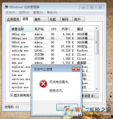 4、这样就可以在at命令运行的任务管理器,取得system的权限之后,这样就可以结束那些无法结束的进程了。下面小编试试能不能结束360杀毒的进程;