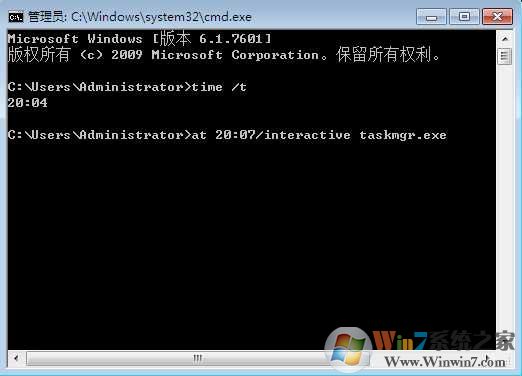 3、接着输入at 20:05/interactive taskmgr.exe 命令,这样2分钟后就会自行启动任务管理器;
