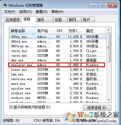 2、打开任务管理器后,查看进程中是否有Explorer.exe ,有的话结束一下。
