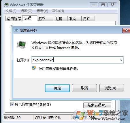 3、接下来,我们再点击windows7任务管理器上的 文件—运行 输入explorer.exe;
