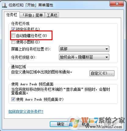 2、如果会,那么再右键点击任务栏,在属性中取消任务栏隐藏的设置。