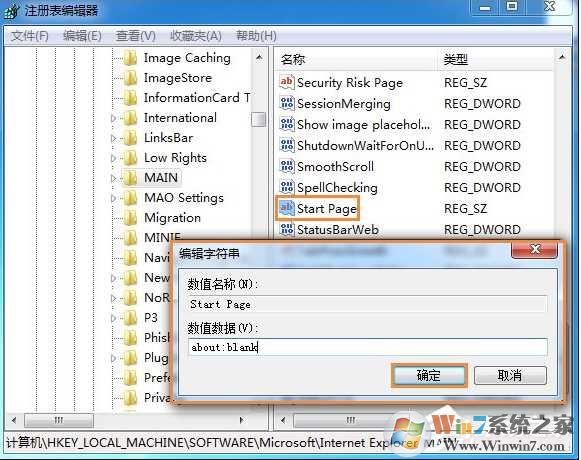 3、然后在右边的窗口中找到文件名同样为“Start Page”的文件双击打开,将“数值数据”里的内容清空并输入“about:blank”,点击“确定”按钮。