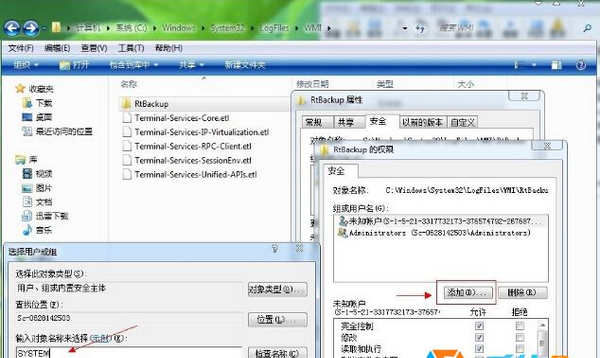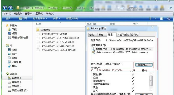 1、从桌面的计算机进入,然后再进和到C盘,找到C:\windows\system32\logfiles\wmi中的【RTbackup 】文件夹,右键点击该文件夹选择属性,并查看“安全"选项卡下有没有system帐户,如果没有,那么继续点击"编辑按钮"打开文件夹的权限页面。如下图所示: