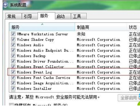 4、然后我们重新启动win7系统,在开始——运行——msconfig——打开系统配置里查看Windows Event Log 服务有没有启动,如果没有启动,记得手动给该服务打上勾并确认即可,当然打开services.msc 也可以进行手动启动Windows Event Log服务,还可以设置启动方式为自动。