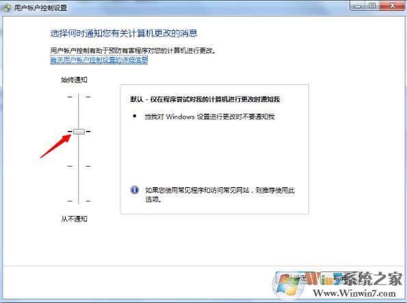 4、红色箭头指着用户账户控制级别,越高越严格,可以拉到最底,然后确定,它就不会在出提示了。