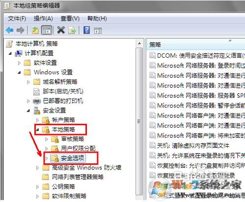 2、打开组策略之后,依次展开 计算机配置—Windows设置——安全设置——本地策略——安全选项;