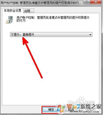 4、这时你需要选择不提示,直接提升,就是点击右边的下拉箭头之后,找到这样一个选项。然后点击确定即可。