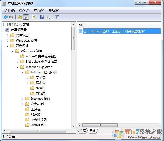 通过组策略可以让internet选项重新显示“内容审查程序”;