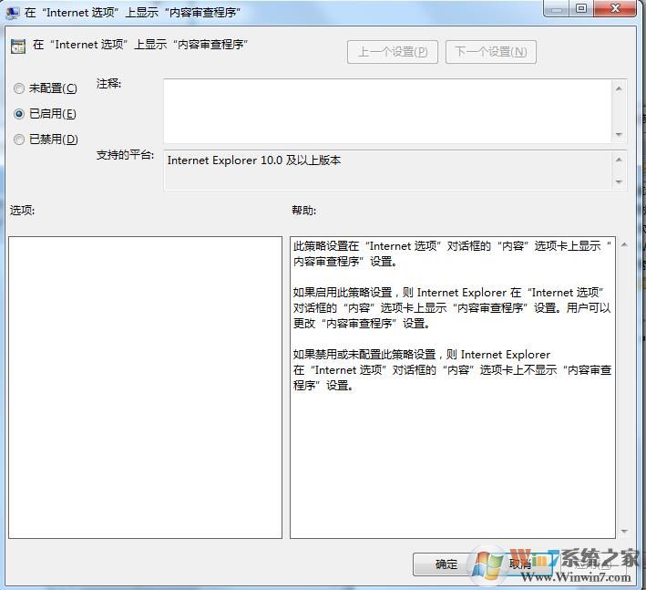 3、双击右侧的,在internet选项上显示“内容审查程序”,然后选择为“已启用”;