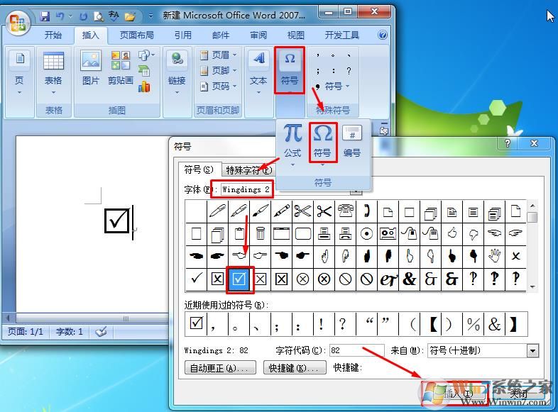 2、继续选择符号,然后把字体设置为wingdings 2 ,这时下方就可以找到方框内打钩符号了。