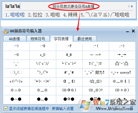 3、有时候,想要其他特殊符号,但不知道怎么打,也可以按照步骤1先打一个啦啦啦。然后在拼音上面会有一个“按分号显示更多符号&表情”。点击就能看到很多特殊符号和表情了。如下图所示。