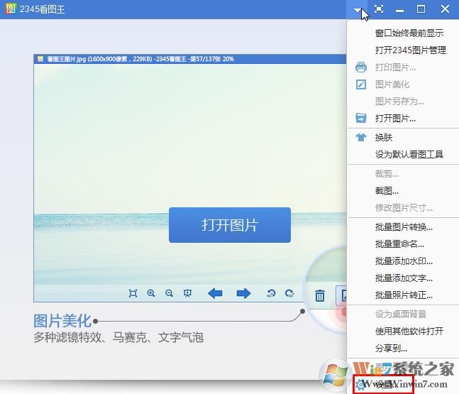 1、或者可以打开看图王,然后点击右上角向下小三角,选择设置;