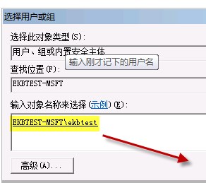 5、在选择用户或组下方对象名称输入框中,填入你需要修复的帐户名称,如果你不记得可以点击“高级”按钮然后“立即查找”来找到登录帐户,选择后单击“确定”;