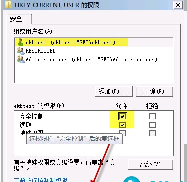 6、接着我们为刚添加的ekbtest帐户添加【完全控制】权限,如下图,打勾然后确定;