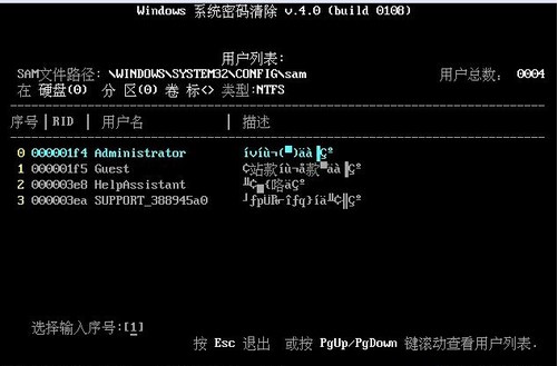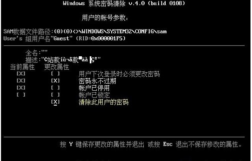 6、如上所示,我们选中 我们要清除的帐户,然后回车,选对清除密码,按Y键就开始清除操作了;