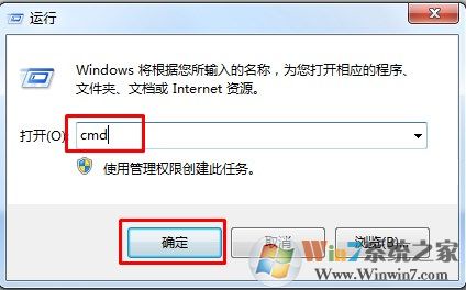 1、首先使用快捷键“Win+R键”打开“运行窗口,接着在窗口中输入“cmd”后点击回车