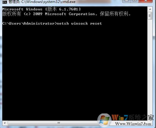 2、然后在命令提示符下输入 “netsh winsock reset”命令并回车,等待片刻即可重置网络