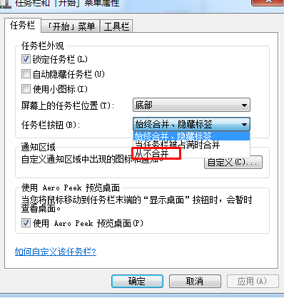 2、小编都没有什么可说的了,因为太简单了,看看下面的图,我们把“任务栏按钮”设置项选择为“从不合并”就可以了;不过小编还是建议选择当任务栏被占满时合并,这样不会太杂乱,不过看自己喜好吧