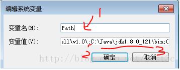 在原有变量值后面添加“;”号(分隔符,如2横线所示),然后再输入C:\Java\jdk1.8.0_121\bin;C:\Java\jdk1.8.0_121\jre\bin
