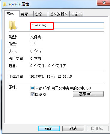 3、这时候我们再打开dianying文件夹属性,可以看到隐藏选项已经可用了,那么我们就可以大大方方的给他设置了。