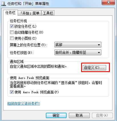 1、右击任务栏选择属性,然后点击“通知区域”的“自定义”按钮;