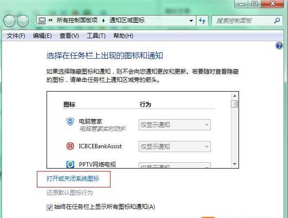 2、在通知区域图标中,点击“打开或关闭系统图标”选项;