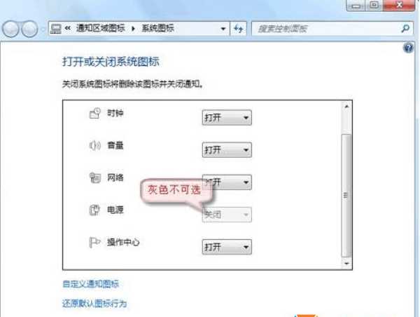 3、在系统图标设置界面,我们找到“电源”设置为“打开”,然后确定保存即可,不过有些用户打开后电源图标打开设置是灰色的无法设置,如下图: