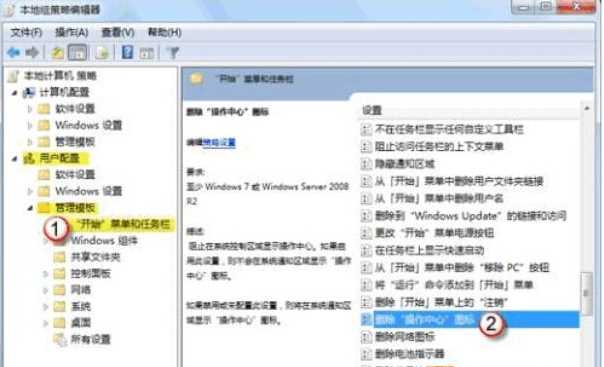 4、那么我们还需要在策略组中进行设置,点击开始菜单,然后在搜索框中输入“gpedit.msc”回车,打开本地策略组后,然后依次展开【用户配置】-【管理模板】-【开始菜单和任务栏】,双击右侧窗口中的“删除“操作中心”图标”,将该项置设为“已禁用”或“未配置”。