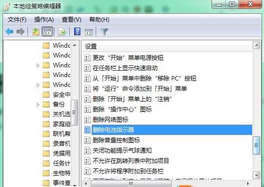 2、在右侧窗口中找到“删除电池指示器”选项,双击该选项然后设置为 未配置或已禁用,最后保存设置;