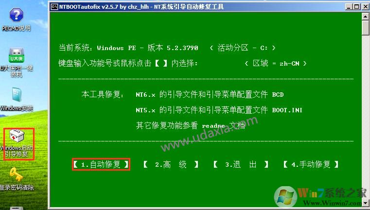 1、进入U盘启动盘的PE系统,在桌面双击运行”Windows启动运行修复”,”选择”自动修复”