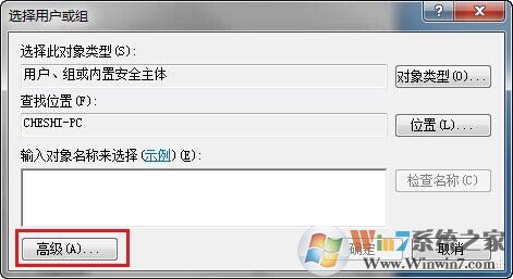 步骤七:选择用户或组的窗口,选择【高级】,如下图所示。