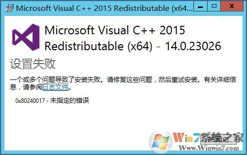 安装VC++2015时提示安装失败,错误代码0x80240017 - 未指定的错误,如下: