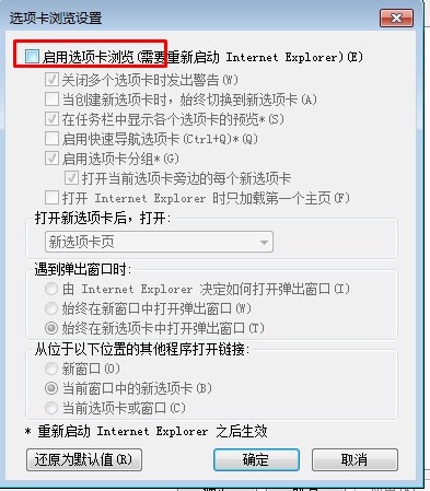 3、在选项卡设置页面,取消勾选“启用选项卡浏览”的选项,然后确定