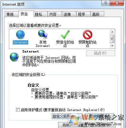 2、在打开的Internet选项窗口中,切换到"安全"选项卡,点击"自定义级别";