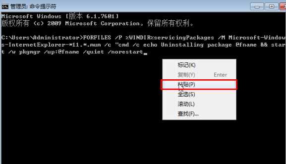 3、在命令提示符中按照不同浏览器版本输入卸载代码,复制起来,在命令提示符框中单击右键,选择“粘贴”,按下回车键即可将其卸载了
